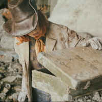 red hair styled to match the costume's theme. The person appears to be in a setting that could be part of their cosplay or role-playing activity, possibly pretending to sort through debris or rubble. The overall atmosphere suggests