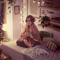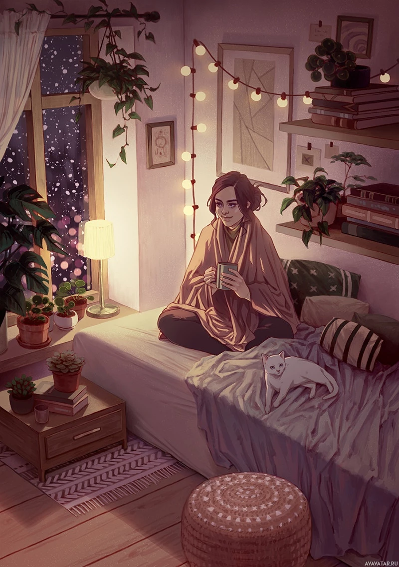 an indoor scene with a girl sitting on a bed. She is wrapped in a blanket and holding a cup, possibly enjoying