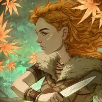 red hair, wearing what appears to be historical or fantasy-style clothing. She is holding a knife in her right hand and has a determined expression on her face. Surrounding her are autumn leaves, which suggests she might be in