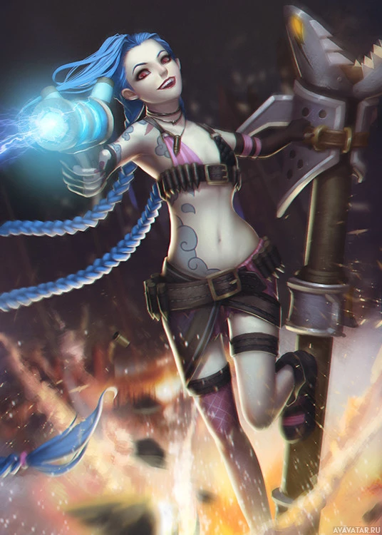League of Legends" known as Jinx. She is depicted in her playful and energetic style, holding a weapon with