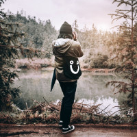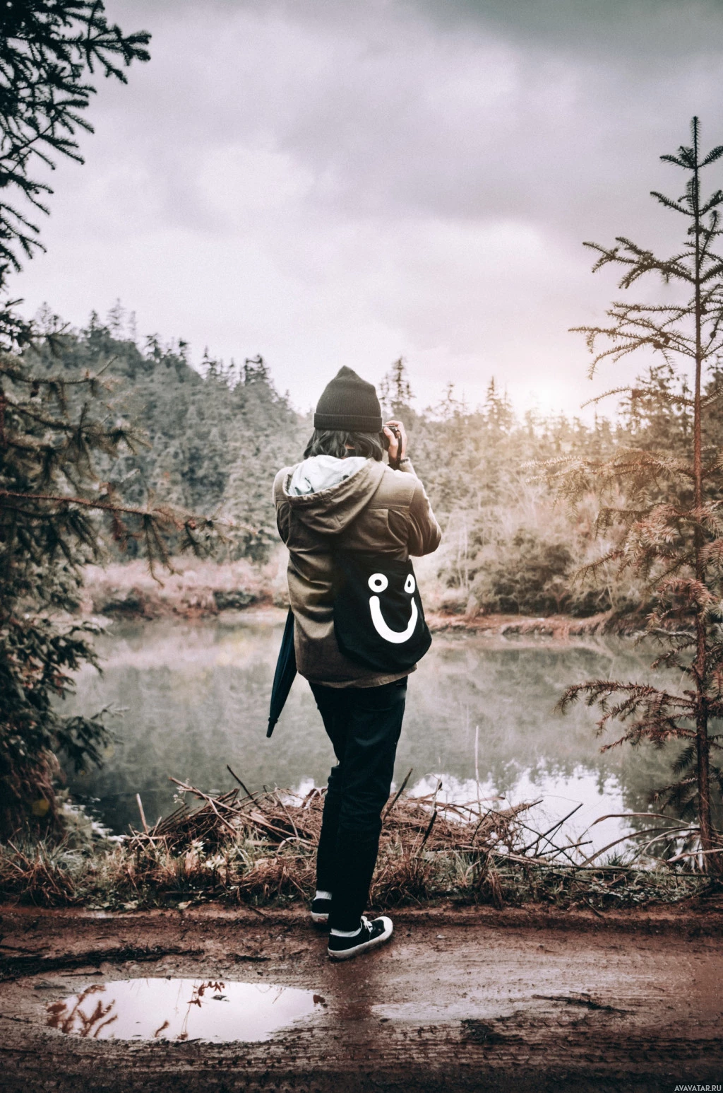 The image shows a person, possibly male or non-binary due to the way they are dressed and styled. They appear to be taking a photo with a camera. In the background, there is a scenic view of a forest with trees, likely pines, and what looks like a small
