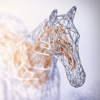 The image features a three-dimensional artwork of a horse's head and neck. It appears to be an artistic representation using a technique that creates a skeletal or wireframe effect, giving the impression of transparency or airiness around the horse's features. This type of art is often associated with modern art movements that emphasize abstraction and three-dimensionality. The use of materials like wire or other fine structures can create an intricate
