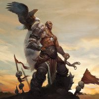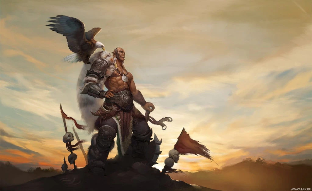 an orc character standing with his arms crossed over his chest. The orc has a prominent and muscular build, with tusks visible on either side of its snout. Behind the orc, to the right, stands an eagle with wings outstretched. In front of the eagle, there is a banner that seems to be attached to it, but the details on the banner are not clear due to the angle and distance. The background shows a sunset with