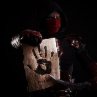 a video game, specifically reminiscent of the Hooded One, an antagonist found in "The Elder Scrolls" series. The character is holding a paper with a handprint on it, which could be symbolic of their involvement or actions related to the game's plot. The image appears to be a cosplay photo where the individual is dressed up and posing as this