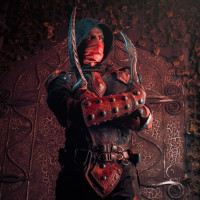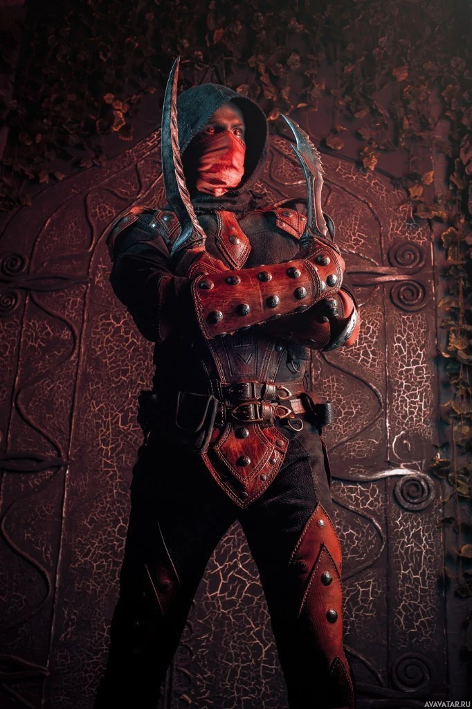 the video game series "The Elder Scrolls." The individual is wearing a detailed costume that includes armor with spikes and