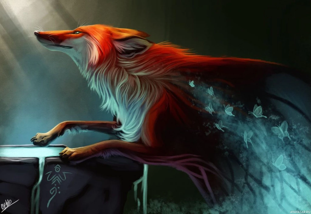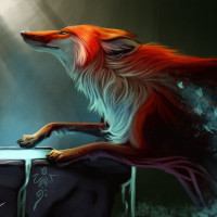 long fur, primarily reddish-brown in color, with white and gray accents on the face and chest, suggesting it might be an artistic representation rather than a specific breed of fox. The background is dark and moody, which contrasts with the fox's vibrant appearance, highlighting its presence as