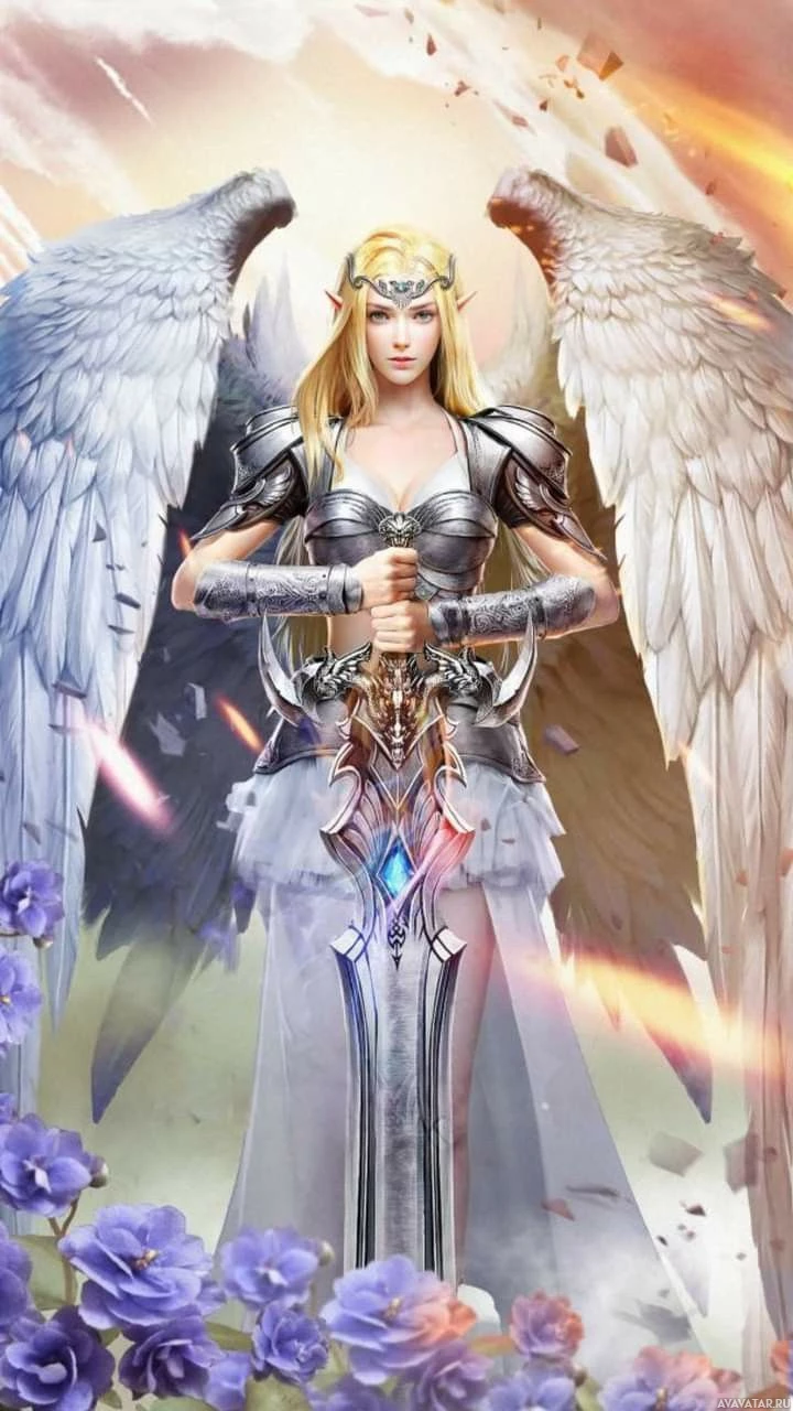 purple flowers and clouds that give the scene a dramatic and supernatural atmosphere. Her attire, with her wings and the presence of a sword, indicate she is likely