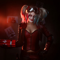 Harley Quinn from the DC Comics universe. They are wearing red and black attire, including a jacket with the Joker's face on it, a corset, goggles, and holding what appears to be a cane or stick. The setting looks like an indoor location with industrial or dingy elements, such as concrete flooring and metal