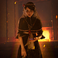 the video game "The Witcher 3: Wild Hunt". She is wearing medieval-style attire with a headpiece and a necklace that suggests she may be portraying a witch or someone involved in the supernatural elements of the game. The character appears to be looking down, perhaps concerned or contemplating something. The setting looks like it could be a scene from within the game where there is some sort of magical or supernatural occurrence occurring around her, indicated by the flames and sparks at her feet.