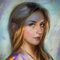 This image features a digital artwork of a young female character. She has long, blonde hair and blue eyes. The character is depicted with a serene expression and is wearing what appears to be an ethereal or fantasy-inspired outfit that could suggest she's from a different realm or era. The background is softly painted in shades of purple, contributing to the otherworldly atmosphere of the piece.