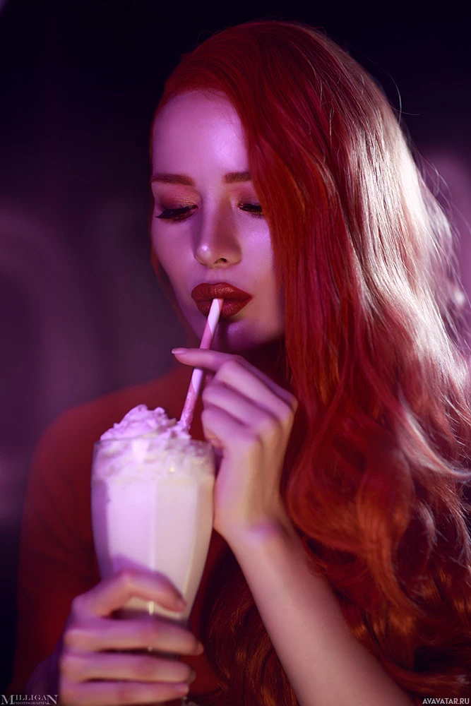red hair. She is holding a milkshake and appears to be enjoying it. She has