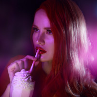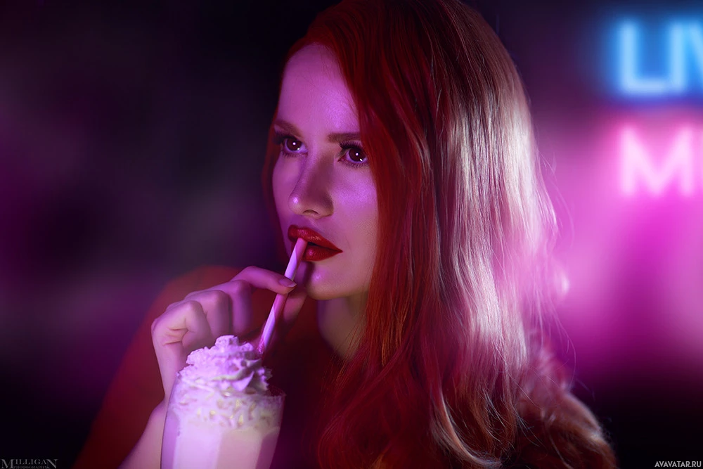 red hair, who appears to be dressed in cosplay attire. She is holding a drink with her right hand and has a straw in her mouth, suggesting she might be sipping from it. In the background, there's