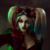 red accents around the eyes, nose, and mouth, and she has her signature hairstyle, which consists of a blonde ponytail with a red stripe in the center. The person is also holding what appears to be a gun in their right hand, which fits Harley Quinn's character as portrayed in