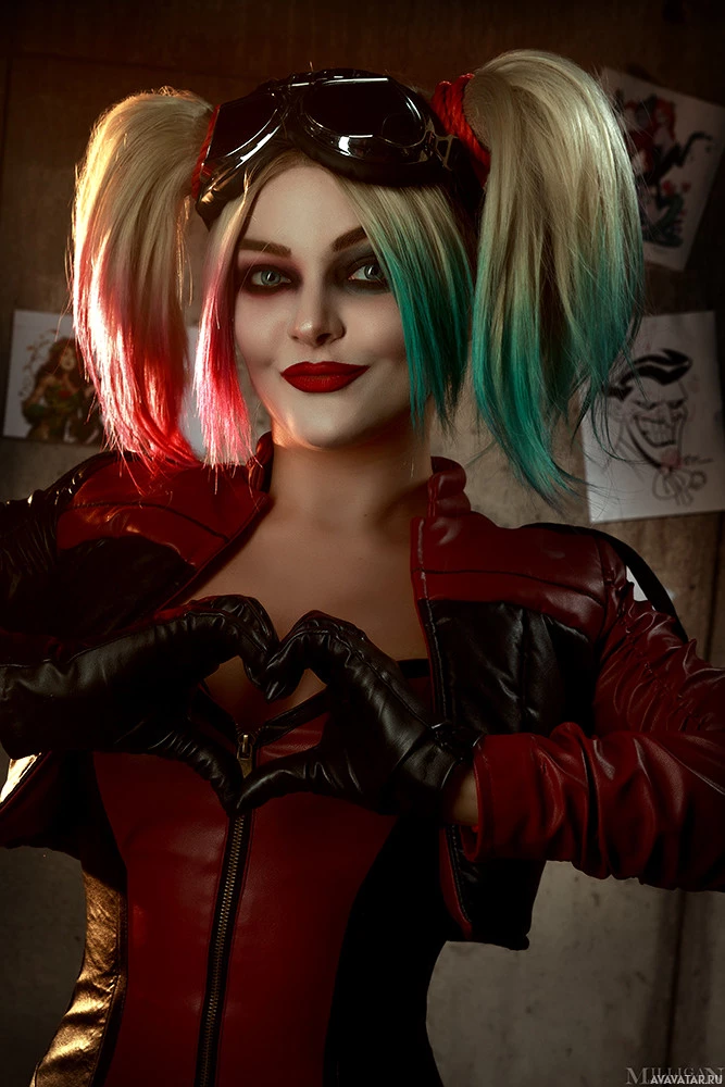 Harley Quinn, a popular comic book and movie character. They are wearing the signature costume of Harley Quinn, which includes red and black