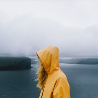 yellow raincoat that stands out against the natural colors of the scene. The hood on the raincoat is up, obscuring the person's head and face from view, creating