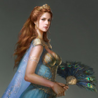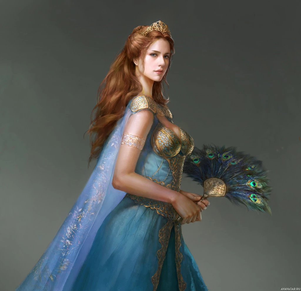 a blue dress that seems to be embellished with intricate patterns and gold accents, possibly indicating royalty or nobility. The woman is also holding a peacock