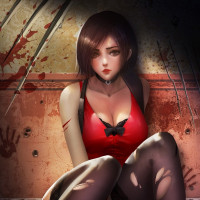 This image features an illustration of a girl sitting in a somewhat distressed or tattered environment. She appears to be wearing red lingerie and fishnet stockings, which contrasts with