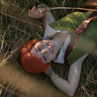 a fantasy outfit that includes elements such as a brown belt around the waist and what seems to be armor-style clothing. The setting is natural with tall grass surrounding them, suggesting