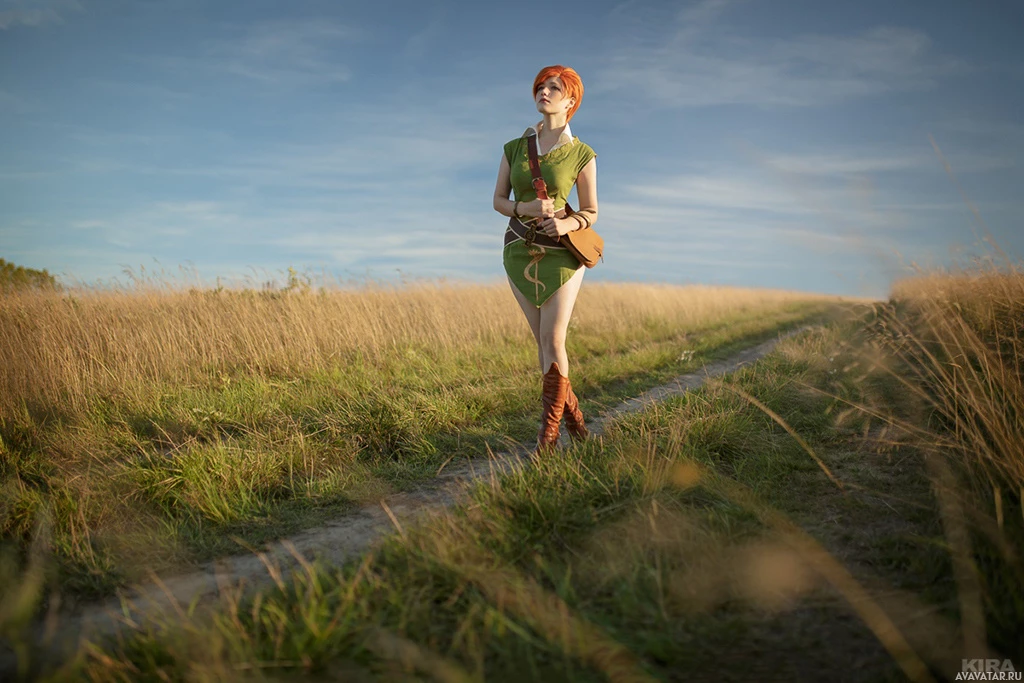 In the image, there is a person who appears to be cosplaying as Shani from "The Witcher 3: Wild Hunt"