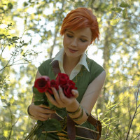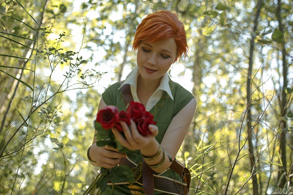 На картине изображен человек, одетый в косплей как Шани из игры «Ведьмак 3: Дикая Охота». Они держат розы и, кажется, находятся в лесу с пышной зеленью вокруг них.