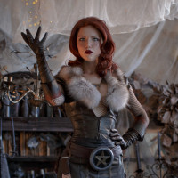 an elaborate costume that includes a corset with fur trim, leather boots, gloves, and a sash. They are standing within a room that appears to be designed to look like a medieval or fantasy-themed setting, complete with a table and various