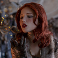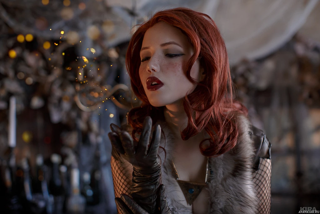 red hair, wearing a costume that includes an animal-like design element on her shoulder. She is holding out her hand and appears to be casting a spell or magic, which is a central theme in the game. The background suggests a mystical setting, fitting