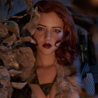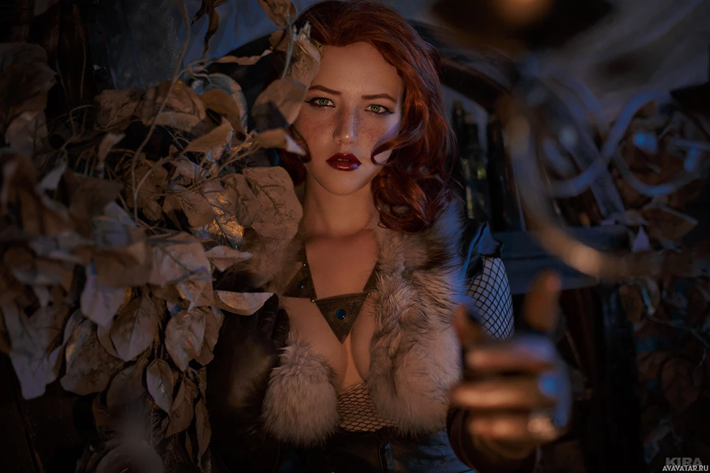 Triss Merigold from "The Witcher 3: Wild Hunt," a popular action role-playing game developed by CD Projekt. The individual is portraying the character in costume, complete with a fur coat and makeup to emulate the character's look from the game. The setting appears to be