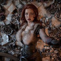 The image shows a person dressed as Triss Merigold, a character from
