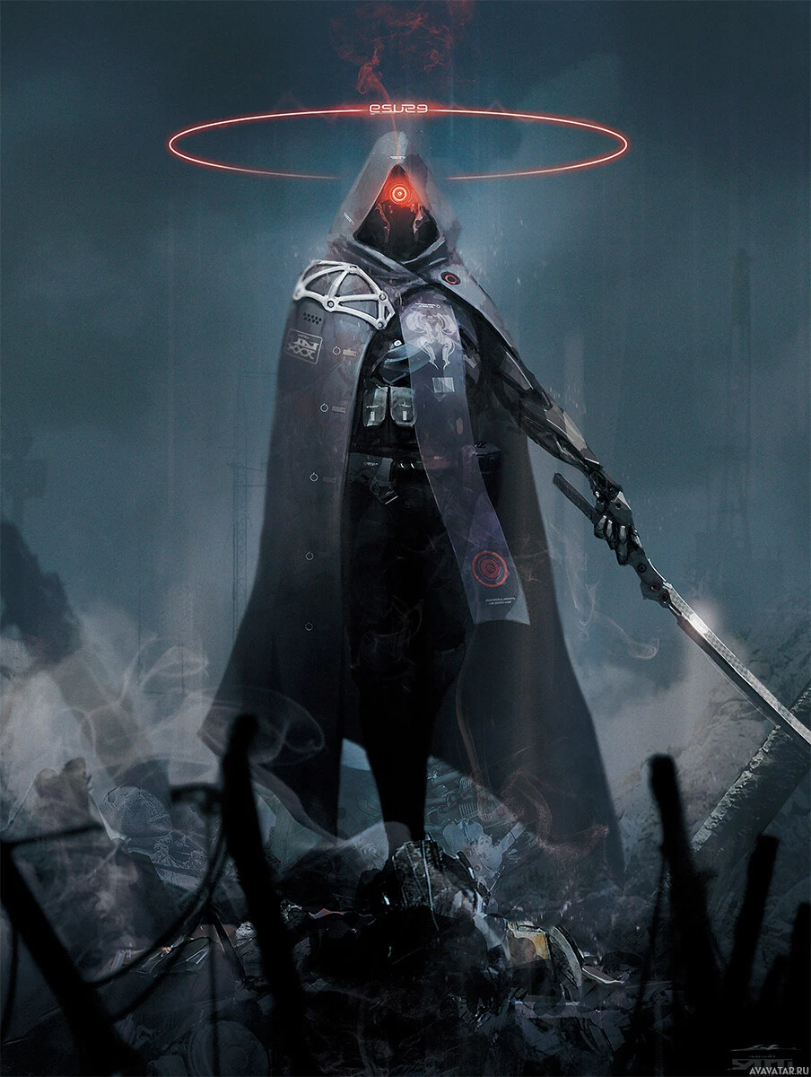 red eye on the character's mask or helmet, which adds to the sci-fi aesthetic. The character is also holding a sword and is standing amidst what looks like