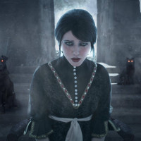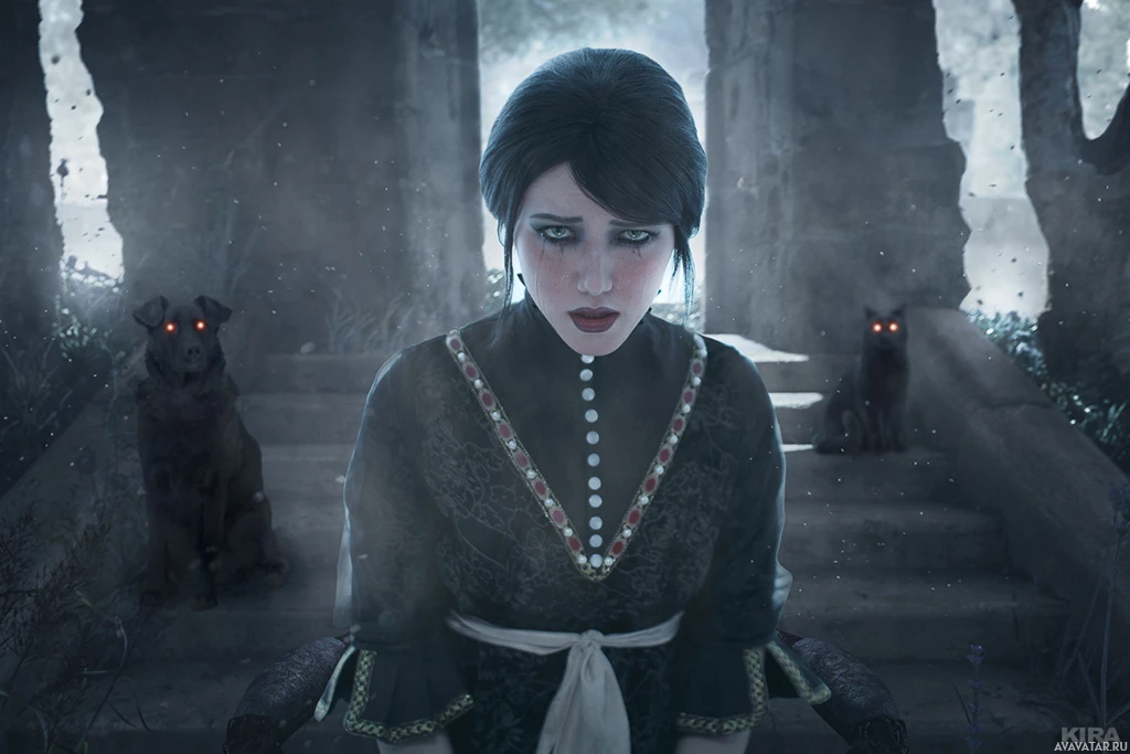 gothic costume and makeup, sitting on a stairway with two wolves flanking her. The scene appears to be from the game's storyline or possibly an artwork inspired by the character.