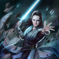 The image features a character from the Star Wars franchise named Rey. She is depicted holding a lightsaber, and her attire includes what appears to be Jedi robes, indicating her role within the narrative as a hero or protagonist.