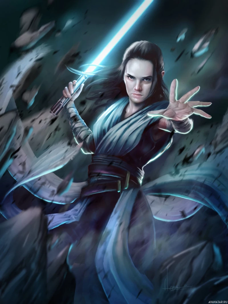 На картинке изображен персонаж из франшизы «Звездные войны» по имени Рей. Она изображена с световым мечом, и ее одежда включает в себя то, что кажется джедайскими одеждами, что указывает на ее роль в повествовании как героя или главного героя.