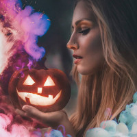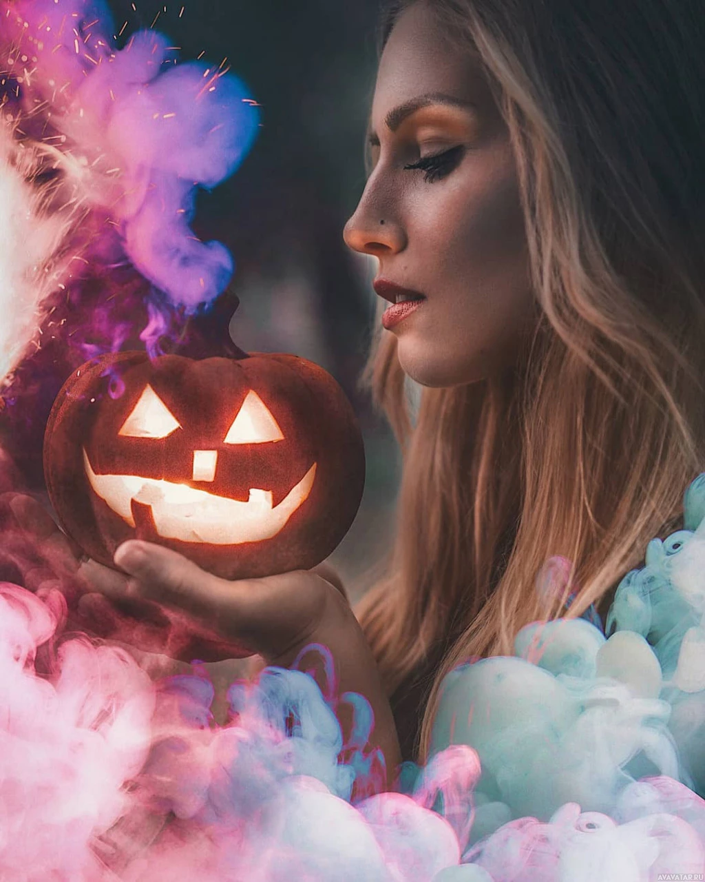 blonde hair holding a lit jack-o'-lantern. There is a magical, Halloween-themed atmosphere around her, with smoke or vapor effects visible in the air and a glowing