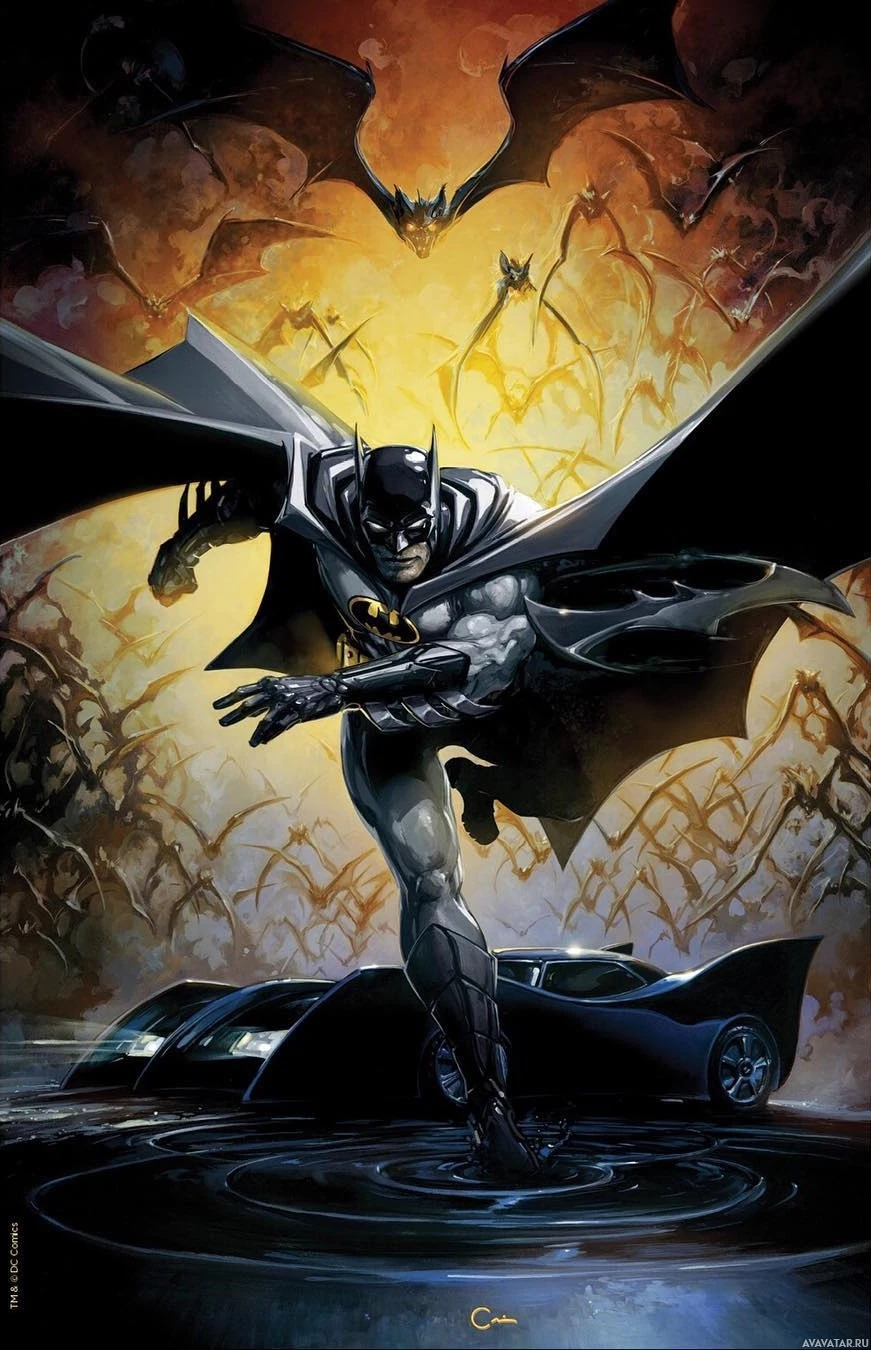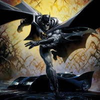 a night scene. The Batmobile is also visible at the bottom left corner of the image, which is typical for Batman's vehicles as he often uses them in his superhero missions. The artwork captures the iconic character in