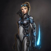 the video game "StarCraft." She is depicted wearing armor and holding a weapon, suggesting she may be a soldier or an agent of some sort. Her attire appears to be futuristic with elements that could imply