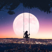 a girl swinging on a swing at night. She is seated and appears to be enjoying the moment, looking out towards the moonlit skyline with a prominent