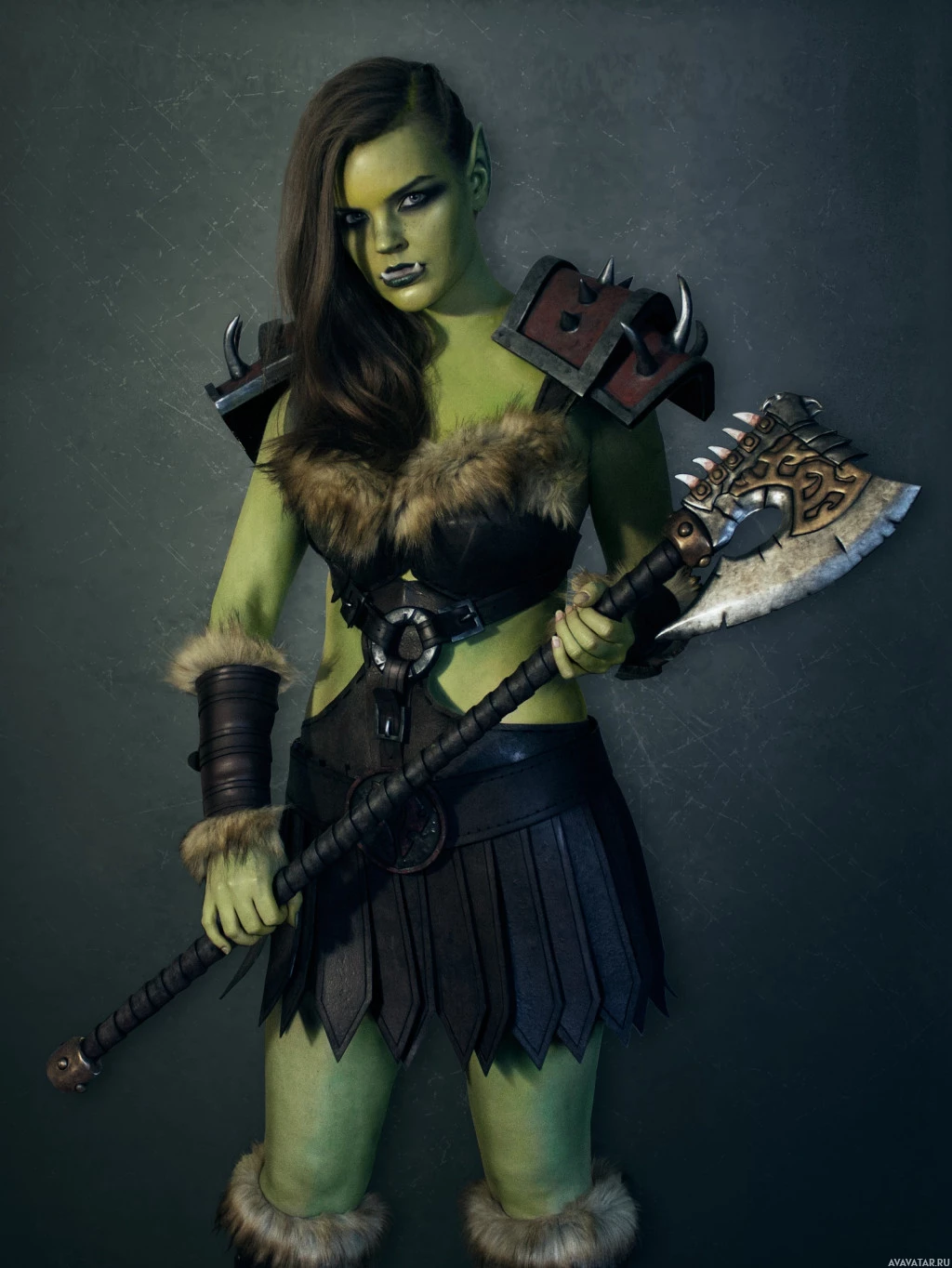 a fantasy orc character. She is wearing green makeup with prominent facial features, such as an exaggerated chin and pointed ears, which are commonly associated with the depiction of orcs in