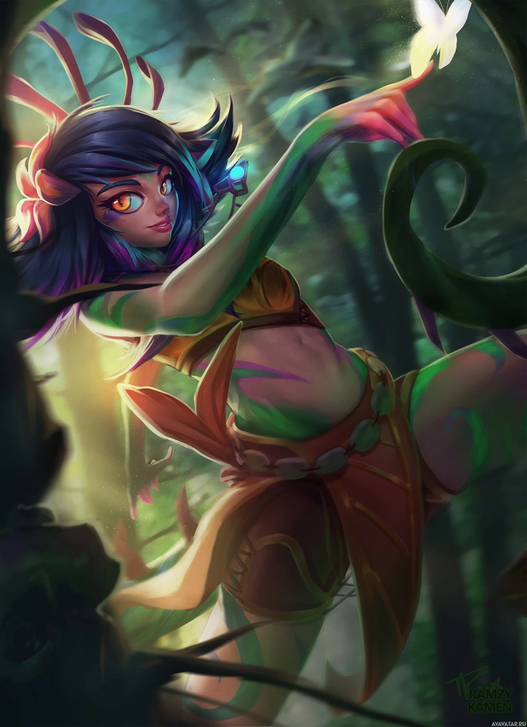 a fantasy setting, surrounded by forest elements. She has