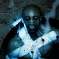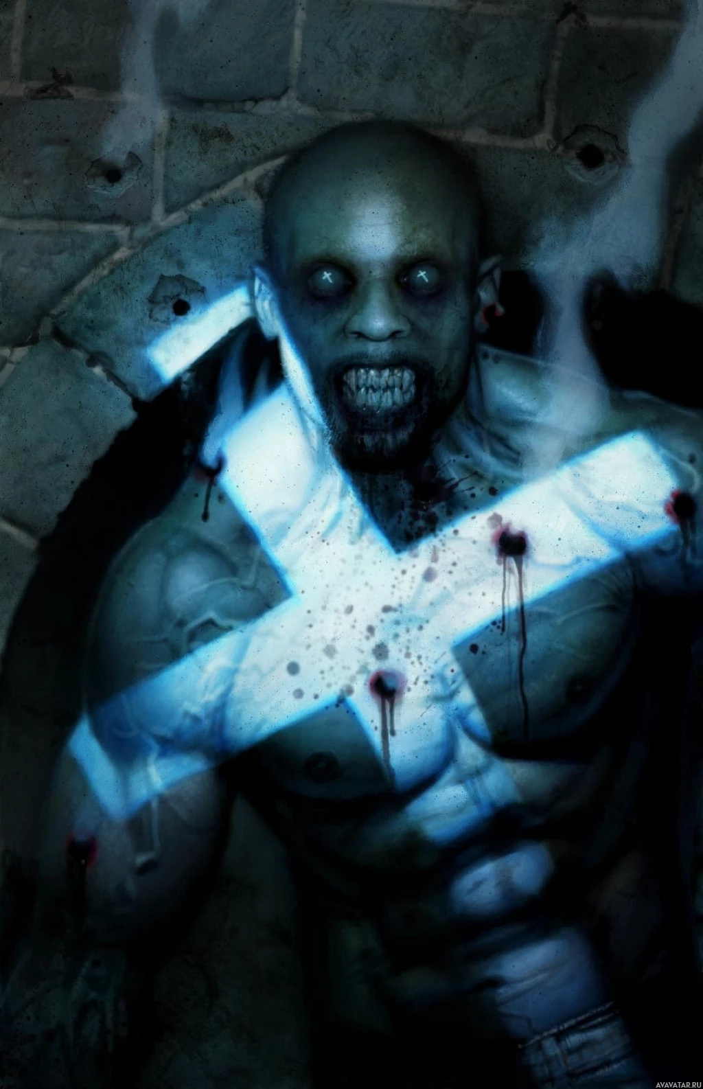 the macabre atmosphere. The background appears to be a dimly lit, possibly underground setting with stone walls and cracks suggesting decay or age.