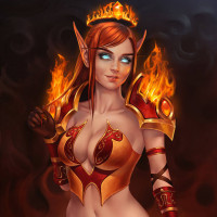 elf character. She has pointed ears, which are characteristic of elves in folklore and fantasy genres. Her skin appears pale, with a hint of red or rosy undertone to her complexion. She is wearing an armor that includes golden accents and what seems to be flames on the shoulders, suggesting she may have some