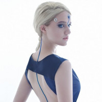 the video game "Detroit: Become Human." She is also wearing a backpack that matches her outfit, indicating she might be cosplaying or dressed up as a character from the game. The background is plain and white, which helps to focus attention on the subject's attire and posture.