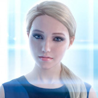 blonde hair and blue eyes wearing what seems to be a black dress. The character is looking towards something off-camera, possibly another character or an event occurring within