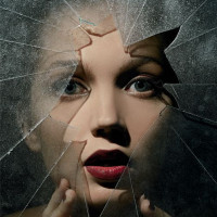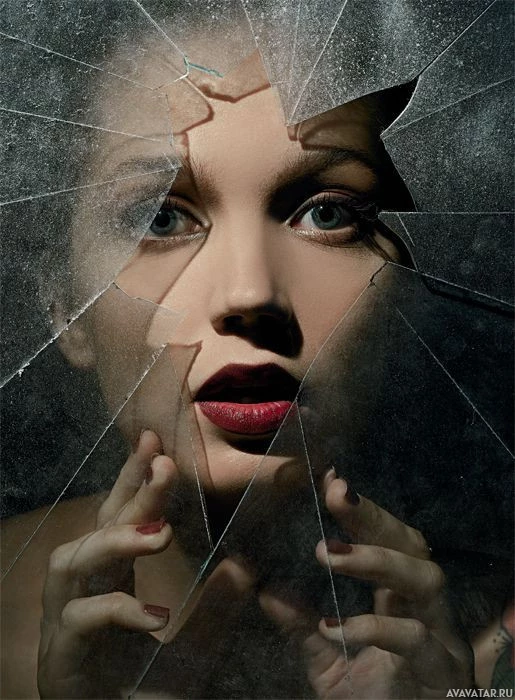 broken glass. Her expression is intense and slightly shocked as she looks directly at the viewer. There are visible cracks in the glass that resembles the skin around her eyes and nose. The background appears dark and moody, which contrasts with the brightness of her face and lips, emphasizing
