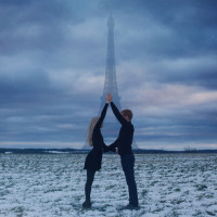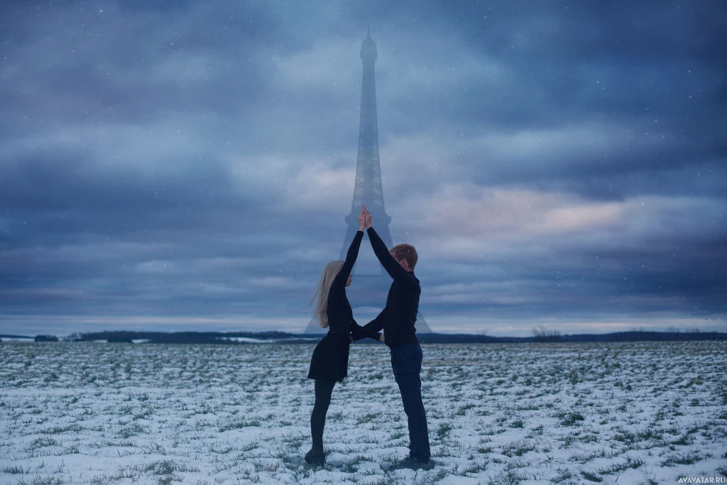 a snowy environment. The structure that resembles the Eiffel Tower is visible in the background, suggesting they might be in