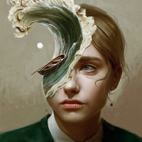 blonde hair, wearing what appears to be a uniform or collared shirt. There is water and a boat featured in the artwork, suggesting that it might be an interpretation of a famous painting with