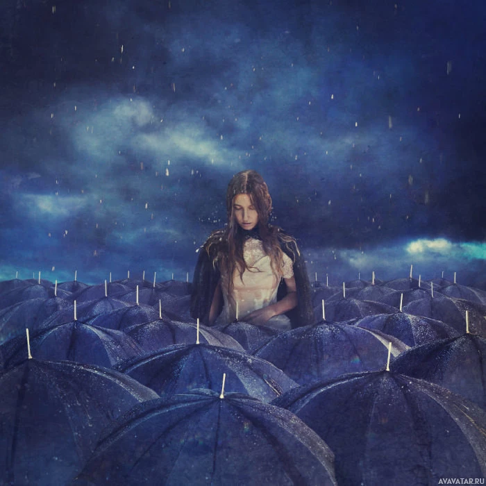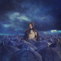 a young woman in a contemplative pose, standing amidst an array of umbrellas. She appears to be wearing a dress and is looking upwards towards the sky, which is filled with clouds that suggest it might be raining or about to rain. The umbrellas are scattered around her, some open and others closed, suggesting they have been used recently, perhaps during a downpour. The lighting is quite moody, with a subdued color palette that emphasizes