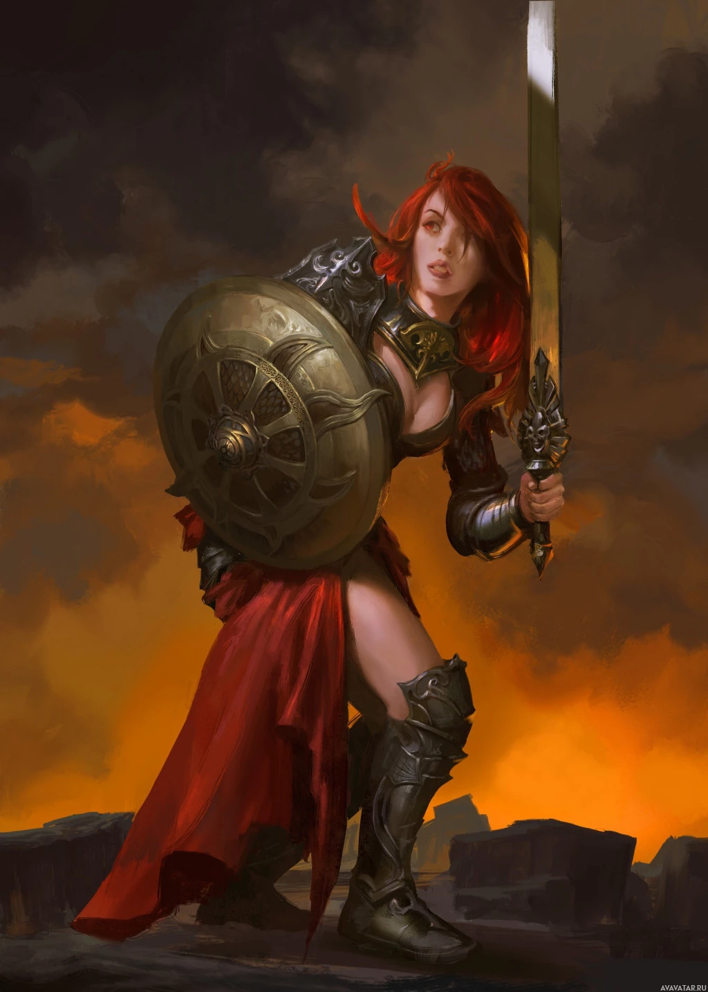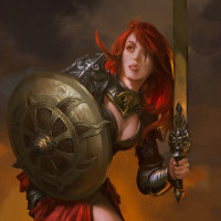 На картинке изображена женщина с рыжими волосами, в доспехах и с мечом. Она изображается как воин или боец из фэнтези или исторической обстановки. Фон предполагает поле битвы или место конфликта.