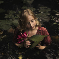 blonde girl sitting in still water, likely in a pond or shallow river. She is holding a flower, which appears to be