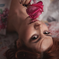 The image shows a woman lying on her back and smelling a rose held to her nose. She has