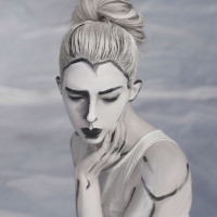 an artistic application, possibly paint or a similar medium, covering the area around her eye and part of her face. She has
